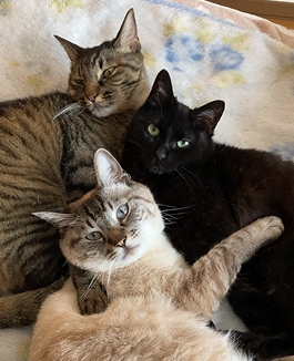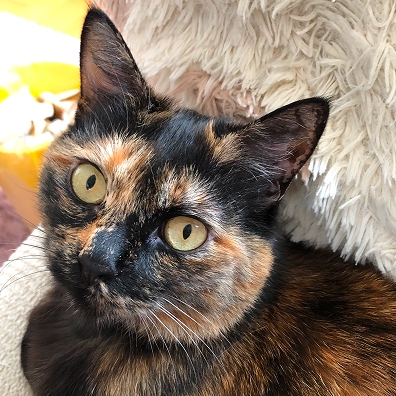 三毛猫のメス、13歳。恥ずかしがり屋だけど最年長の威厳も保っている。萌歌と意見が合わない時には猫パンチで黙らせる。