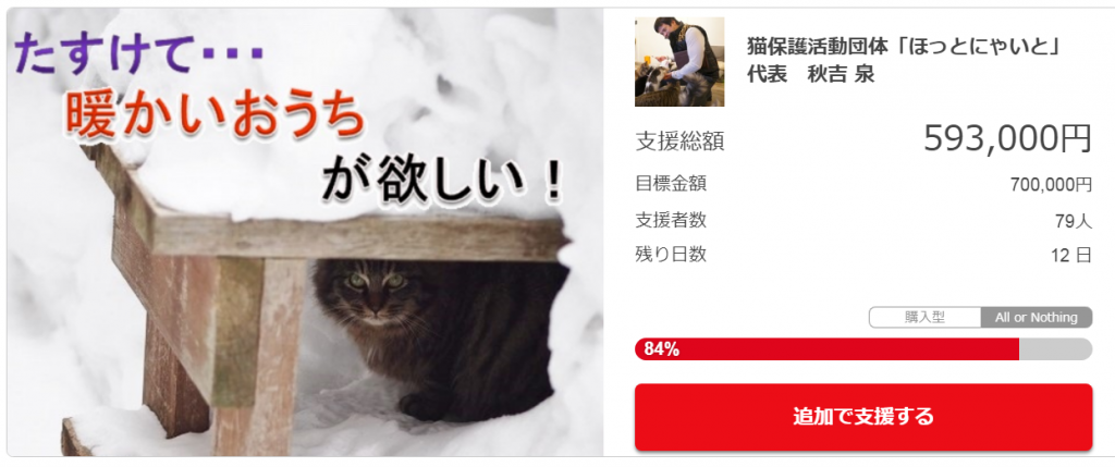 ネクストゴールはにゃぱんの春までのペレット代を優先に、ほっとにゃいとのスタートアップ活動費にしたいと考えております。
