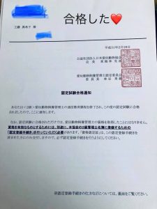 代表と副代表は愛玩動物飼養管理士2級の通信課程を修了後の資格試験にて合格いたしました。
